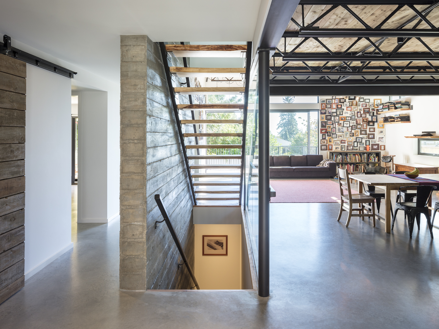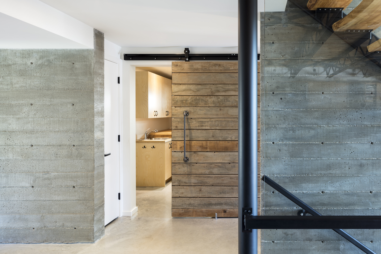 The family wanted to use as much recycled material as possible from their previous home. For the stairs down to the basement, we repurposed their old floor joists and ceiling rafters to give the place a homely, yet modern industrial vibe.