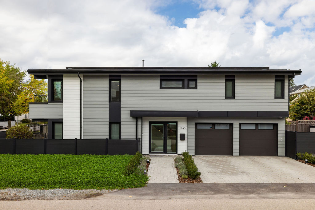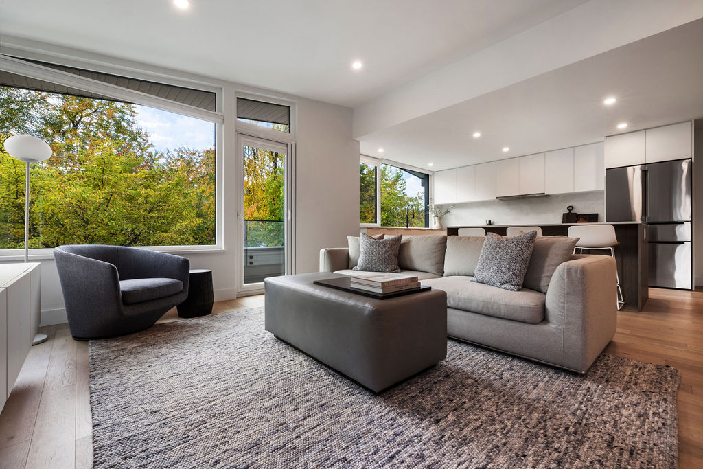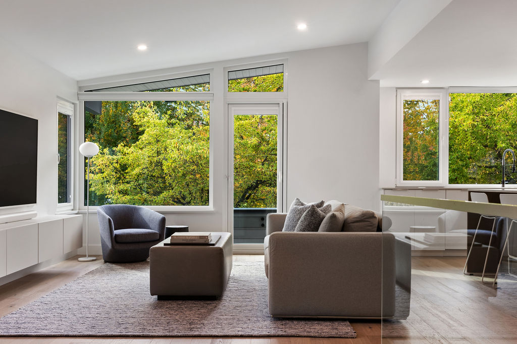 To cut operational emissions, we removed the fireplaces and introduced induction cooktops, a solar PV system, triple-glazed windows, and high performance heat pumps for heating and cooling. We also made the home far more airtight, helping the client save on those hydro bills.