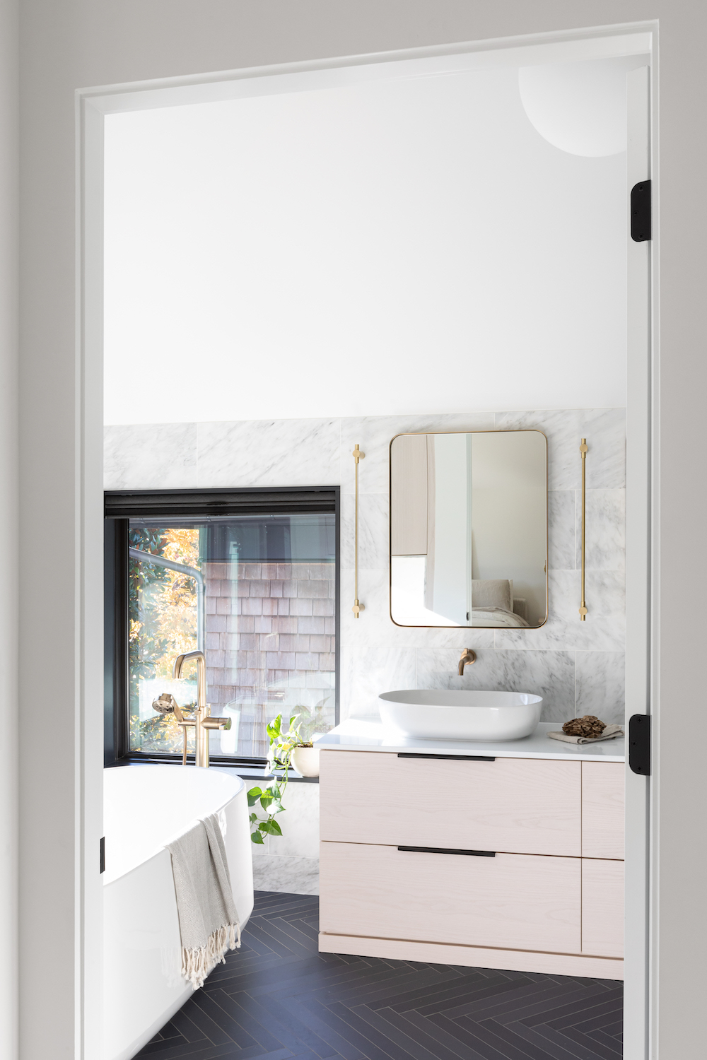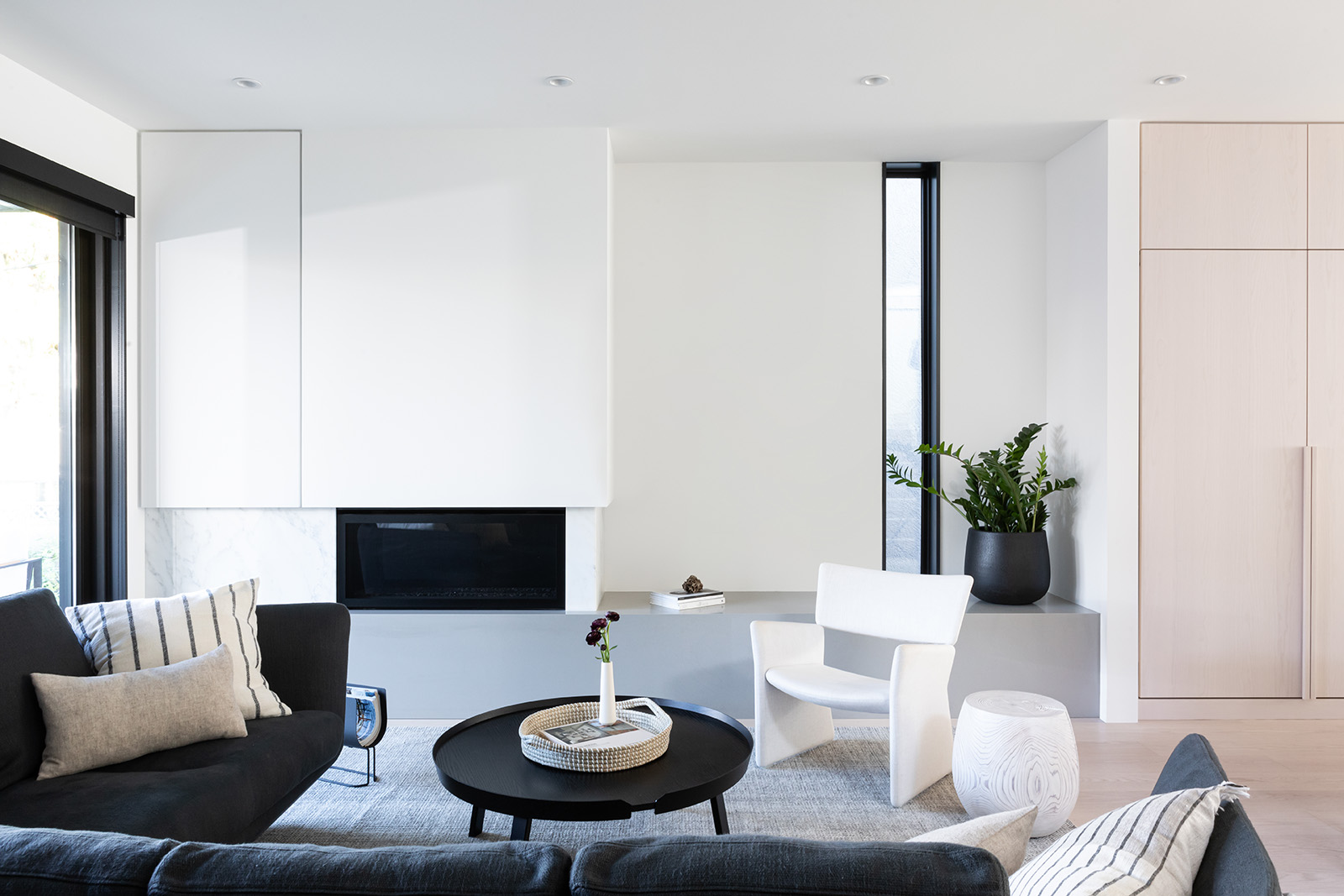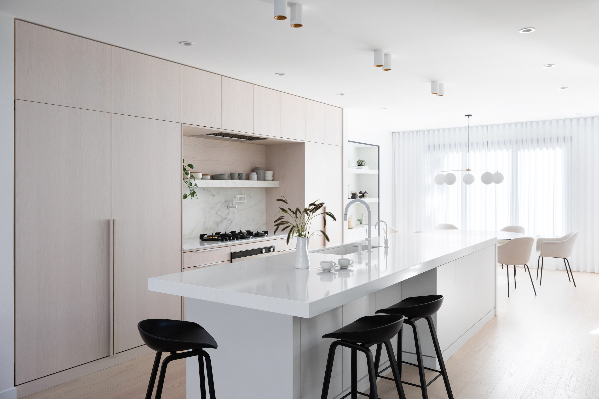 The interior contrast of black and Japanese-inspired, maple wood tones create a modern, minimal, aesthetic. Natural light floods into the dining room and kitchen, while bold compositions of black casings provide depth and contrast to denote the places where the family comes together.